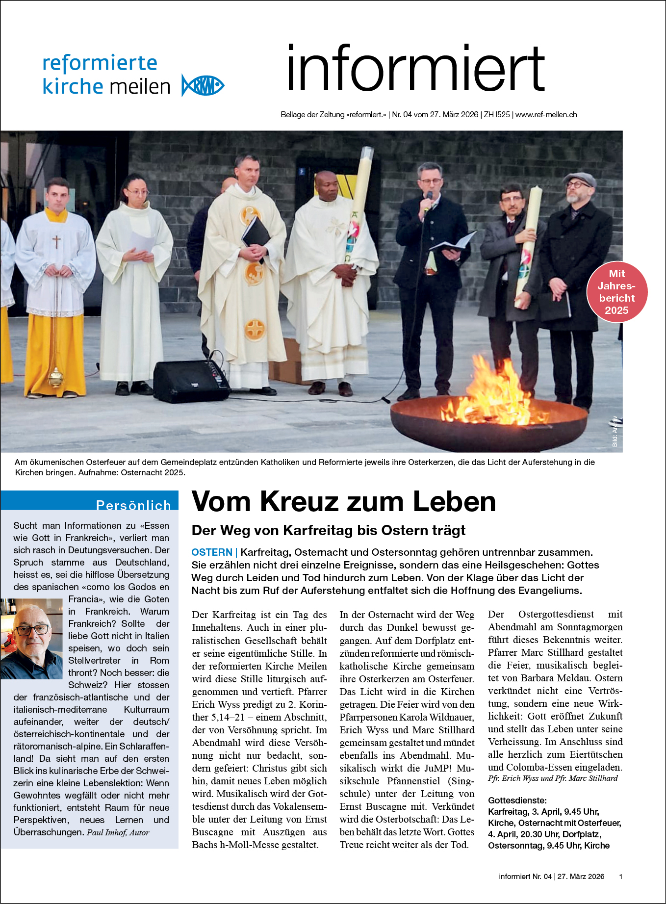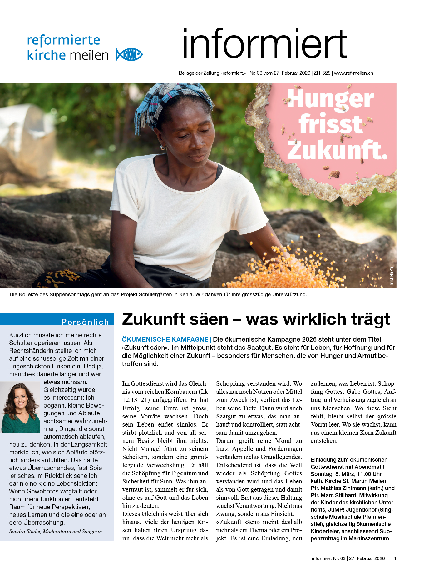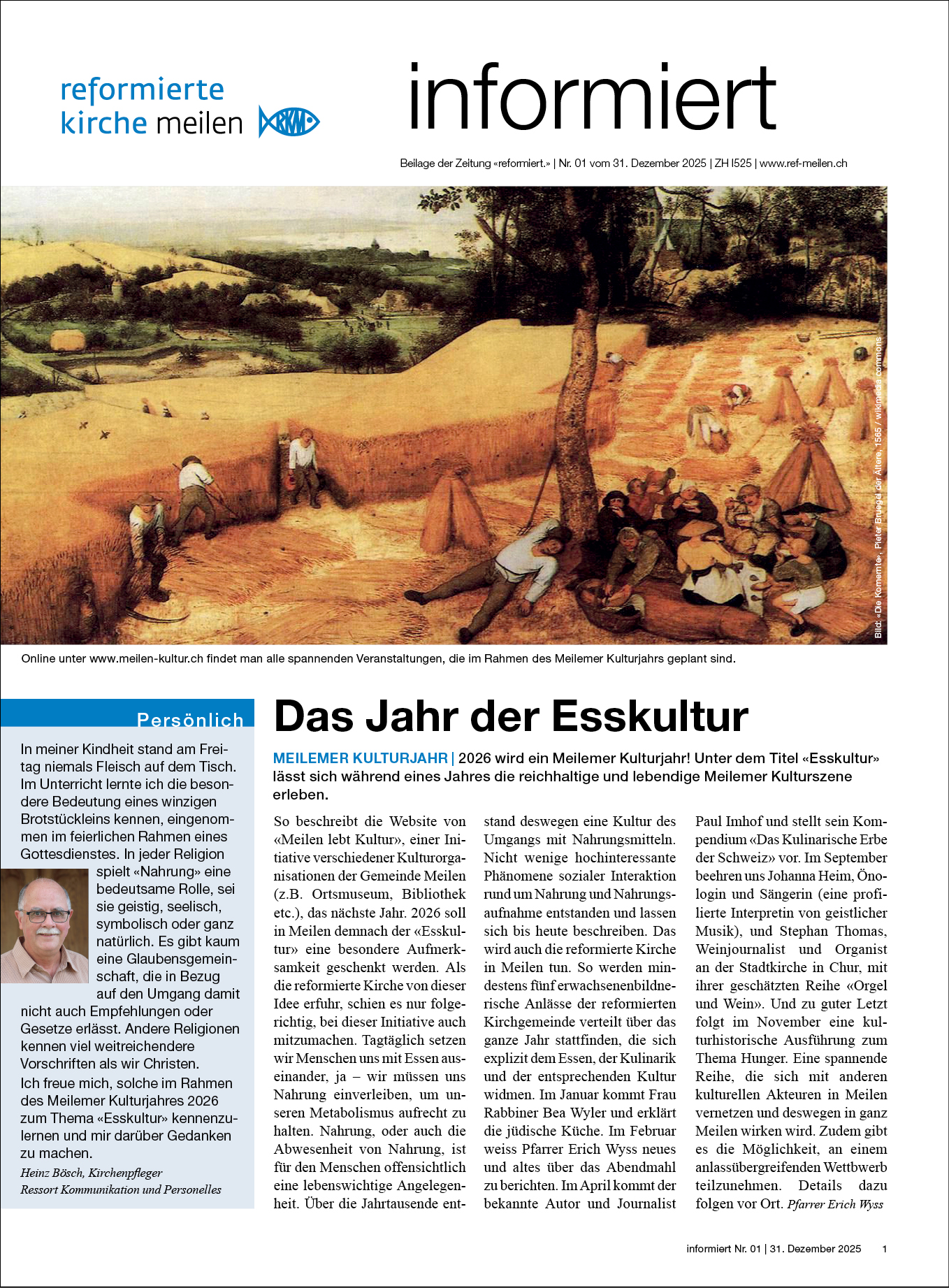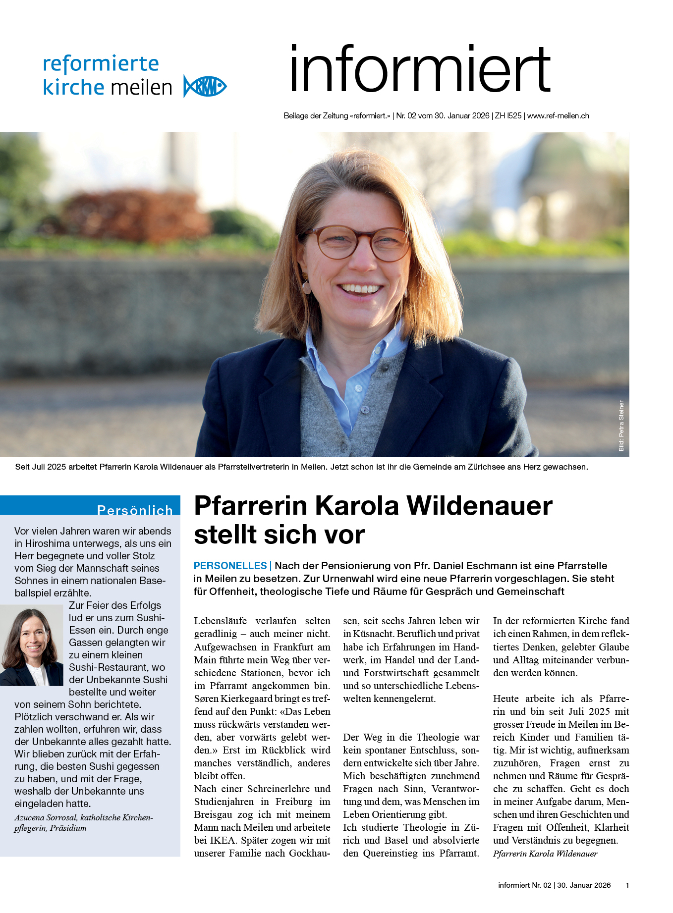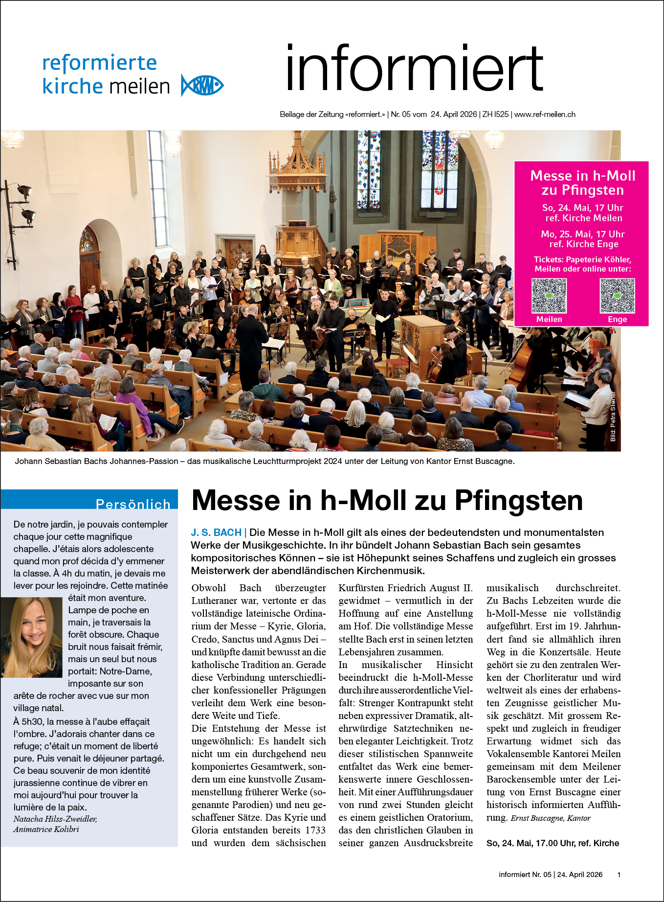Unsere Gemeindebeilage «informiert» erscheint zwölf Mal im Jahr. Sie wird der überregionalen Zeitung «reformiert.» jeweils am Ende des Monats beigelegt.