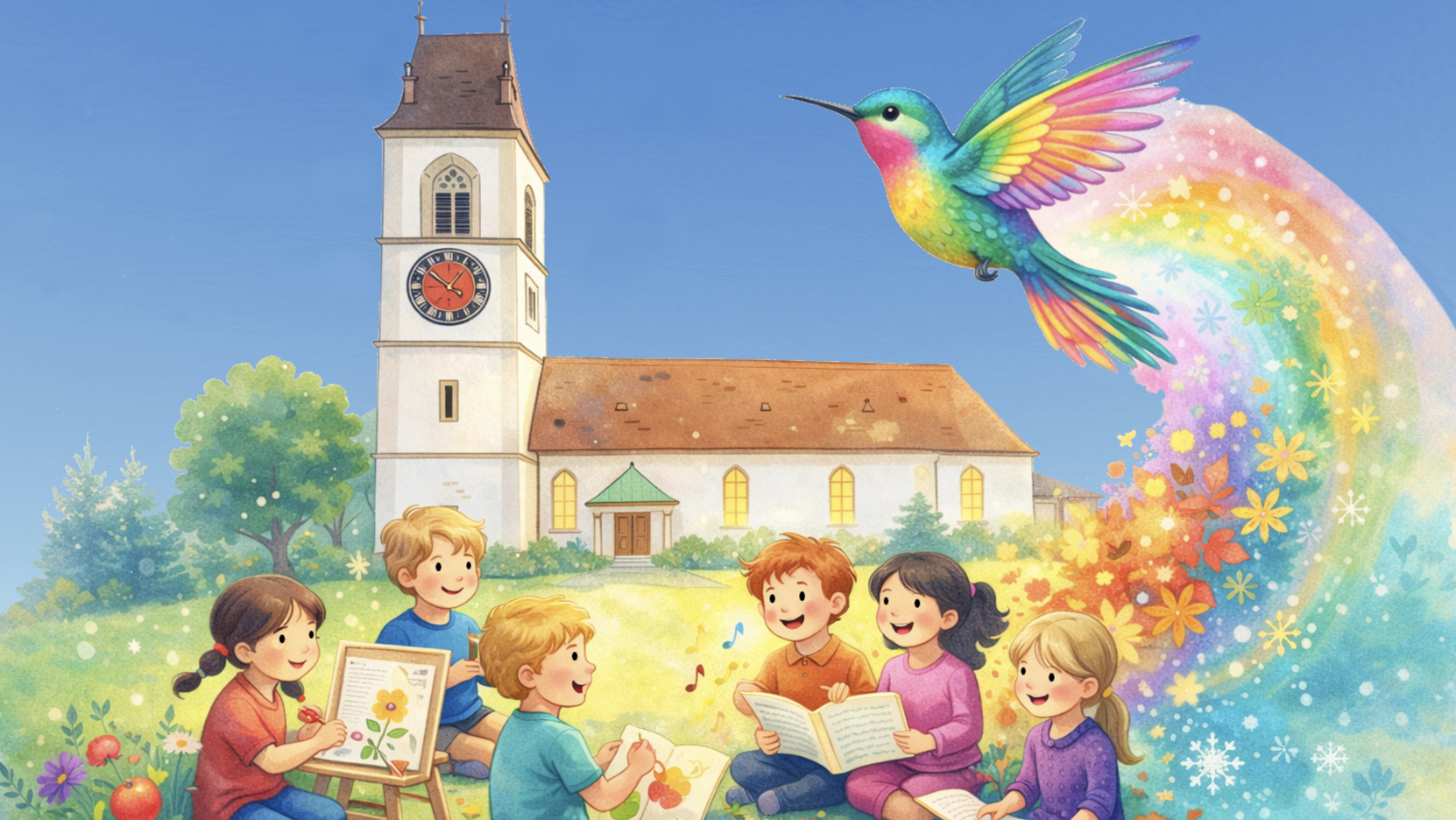 Das Kolibri ist ein Angebot für Kinder vom 1. Kindergarten bis Ende der 1. Klasse und findet jeweils am Samstag von 9 bis 12 Uhr im Bau sowie in der Kirche und Umgebung statt; zur selben Zeit wie der 2. Klass-Unti. Somit können Geschwister ihr kirchliches Angebote gleichentags besuchen.
